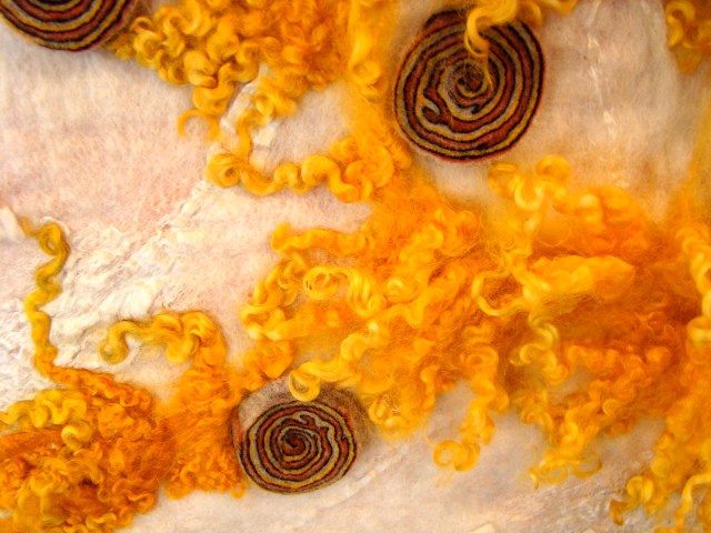 “Vilt is misschien wel de oudste vorm van textiel. De oudste fragmenten textiel zijn tenminste van vilt en die zijn meer dan 8500 jaar geleden gemaakt. Mensen maakten al vilt, lang voordat ze leerden breien en weven. Vilt maak je door plukken wol met warm water te bevochtigen en dan eindeloos te wrijven. Zelf gebruik ik daarbij olijfzeep omdat dit prettiger werkt. Bij het vervilten haken de wolvezels in elkaar. Het verviltingsproces neemt zijn eigen tijd en valt niet te versnellen. Arbeidsintensief is het vooral, want als je het veelzijdig wilt verwerken, heeft het meer stevigheid nodig. Dit kun je bereiken door er andere vezels doorheen te mengen. Zelf werk ik dakpansgewijs met verschillende lagen van vaak verschillende materialen, voor het mooiste resultaat.”