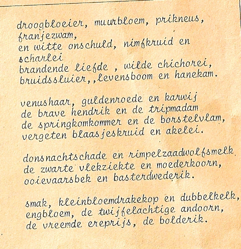 Dank je Erica! Misschien leer ik het wel uit mijn hoofd en zoek alle plantennamen erbij. Voor mij is het een stuk onvergankelijke poëzie, en dan te bedenken dat vrijwel niemand dit kent.