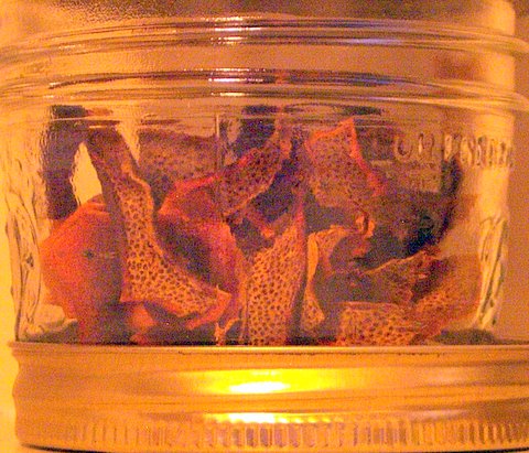 6.Fakkeltje. De olie in sinaasappelschillen is ontvlambaar. Pers maar eens met je hand een sinaasappelschil samen als er een kaars brandt. Voorzichtig, want er ontstaat een vuurtje! Ook gedroogd blijft enige olie achter. De schilletjes blijven langer branden dan twijgjes, zodat je een beginnend haardvuur tijd kan geven zich te verspreiden. En het ruikt nog lekker ook. Je kunt ook met het vocht uit verse sinaasappelschillen een strook papier bevochtigen en die drogen; een uitstekend ‘aanmaakblokje’.