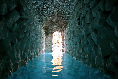 Dit zijn thermische bronnen in een niemandsland, onze bestemming van vandaag. Wij zevenen zijn de enige bezoekers, de stilte is immens, maar zelfs in deze kou geurt de woestijn heerlijk, nog afgezien van de mentholgeuren uit het warme binnenbad. Van cement zijn hier kunstmatige holtes geboetseerd bovenop wat natuurlijke holtes lijken, met looppaden van zachtroze klinkertjes, ‘very American’ hoor ik weer zeggen. Het warme water wast alle muizenissen weg zodra we afdalen. Een holle, dampige gang met vocht druipend van de wanden leidt ons omlaag naar een ovenvormige, grot waar het water in stralen van de wanden stort.
