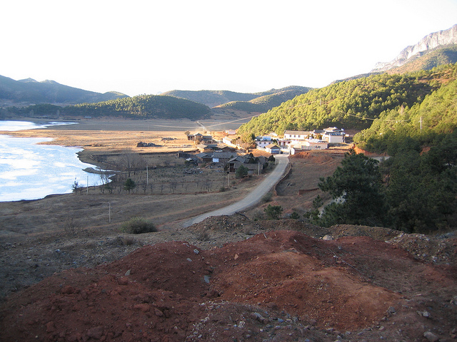Om het Lugu-gebied binnen te komen betaal je ongeveer 5 euro, op je kaartje staat dat dit geld ten goede komt aan cultuur- en natuurgebieden. In de bus passeerden we vaak loodwolken uitstotende trucks met in de laadbak indrukwekkend dikke boomstammen, uit heuvels die nog meer afgelegen zijn dan waar we nu zitten. In de dorpen aan het meer steken vaak een of twee gebouwen prominent boven de andere huizen uit. Dat zijn karaoke-hallen, hotels en danszalen Chinese stijl, waar men de Lugu-cultuur in getemde stijl aanbiedt waardoor die aantrekkelijk wordt voor Chinese toeristen.
