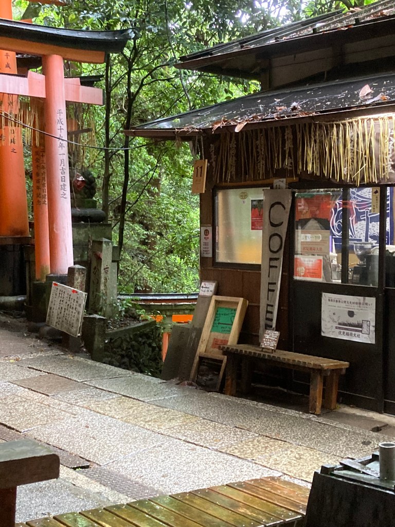 Wij bestellen een kopje thee bij een oude man op de berg met Tori I, dat is de naam voor honderden ceremoniële poorten, deel van het Fushimi Inari Taisha heiligdom, een Shinto-tempel uit 794. Het shintoïsme is de inheemse religie van Japan. Het shintoïsme is een natuurgodsdienst. Natuurgeesten (kami) bezielen bomen, rivieren, bergen… Tempels werden opgericht waar mensen een bijzondere aanwezigheid voelden. Onze Mariabronnen (gekerstende heidense bronnen) zijn ermee te vergelijken.